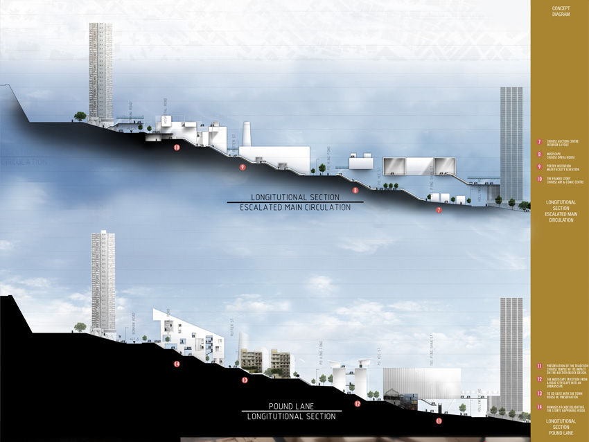 CONCEPT - We would like to use this element to frame up the nature in a “comic” way. To make the space look interesting and enrich the relationship between building, human, and nature. The space is clearly define into 2 sectors with landscape on the right and main circulation on the left, The main block functioning as a divider and the circulation side relink the existing pound lane. Such a stragies focus to revitalize the existing pound lane by filling it with live, people walking by and things happening inside the space, thru some mini blocks, Those mini blocks respect the level different of the existing typology of the site. So that people passing thru on each level have access to the building seeing the according program happening.